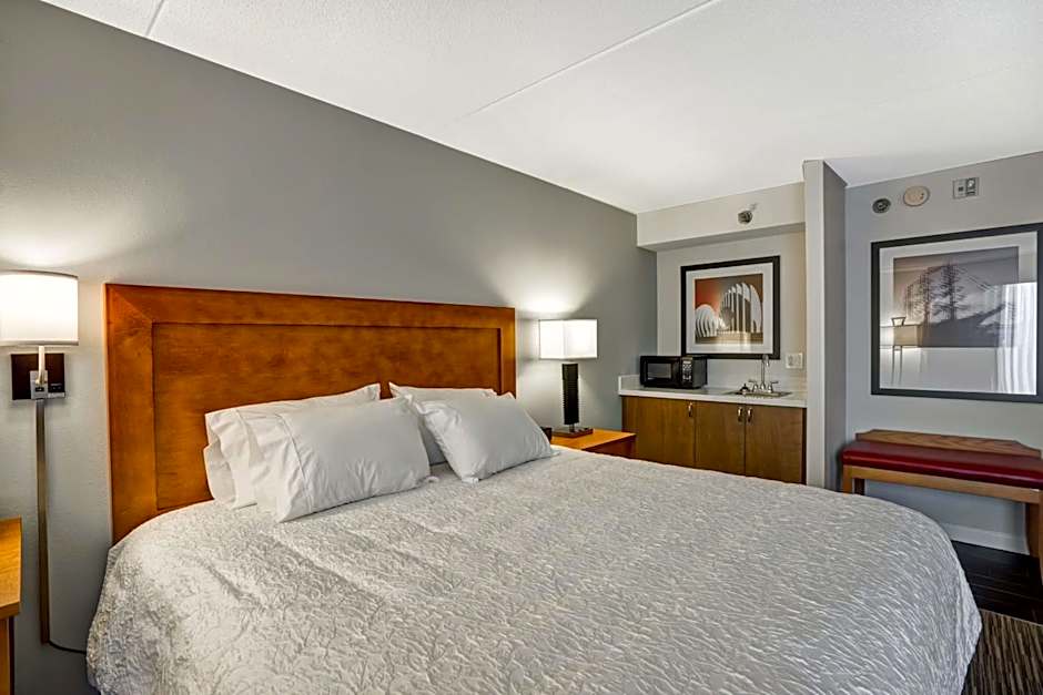 This hearing accessible guestroom includes a flat-screen TV, work surface and free WiFi. A microwave, small refrigerator and coffeemaker are also provided. It includes a hairdryer and ironing facilities.