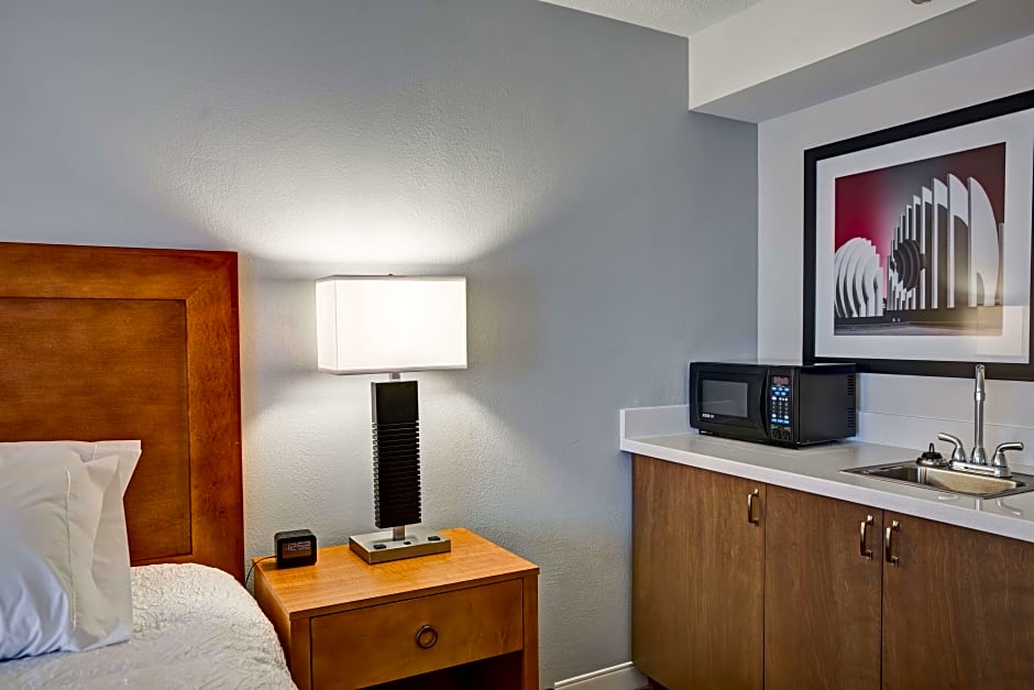 This guestroom includes a small refrigerator, microwave and coffeemaker. A work surface, hair dryer and ironing facilities are also provided, as is a flat-screen TV.